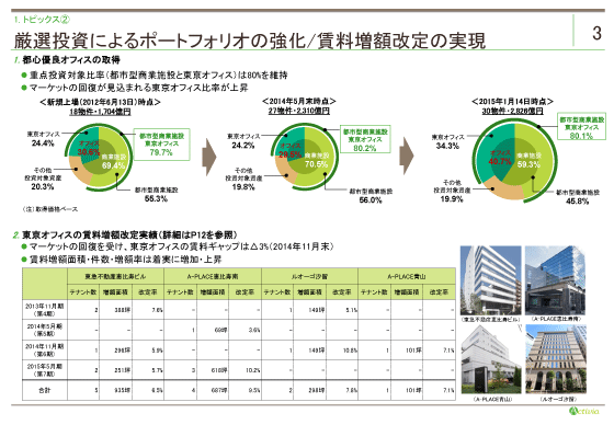 トピックス2つ目は、ポートフォリオの強化、についてです。 重点投資対象である都市型商業施設と東京オフィスの比率は、80%を維持しています。 また、直近取得した大崎ウィズタワーや汐留ビルディングといった都心の優良大規模オフィスの組み入れにより、ポートフォリオのオフィス比率は、30%から40%に増加しています。 次にご説明する東京オフィスの内部成長の実績を鑑みても、オフィス比率の向上は、今後のポートフォリオの成長に大きく寄与するものと考えます。