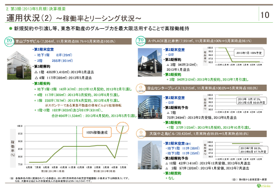 まず、課題でした青山プラザビルについてです。 青山プラザビルについては上場来苦戦を強いられてきましたが、東急不動産のリーシング力を最大限活用することで、100%稼働を実現致しました。 特に、1階238坪については、東急不動産保有の他物件にご入居されていたテナント様の拡張移転に伴う埋戻しを行っており、また、A-PLACE恵比寿南については、退去が発生したものの、すでに新規契約を締結済みで、7月には100%稼働の予定です。 このように、渋谷を中心としたエリアは需給がタイトになっており、今後は空室率の改善から、賃料の上昇が期待されるエリアと考えております。 次に、現在稼働が100%である金山センタープレイスについては、2月に解約予告を75坪受領しましたが、既に37坪が契約済みとなっており、大阪中之島ビルについては、6~7月に140坪の解約がありますので、内部テナントの増床も含め、リーシングに注力しております。
