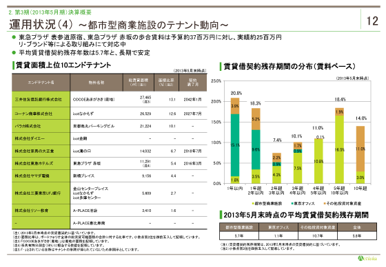 次に、都市型商業施設のテナント動向について、ご説明致します。 都市型商業における賃料は、長期契約且つほぼ固定賃料ですが、東急プラザ表参道原宿及び東急プラザ赤坂は一部歩合がございます。 第3期の歩合予算は約37百万円に対し、決算は約25百万円となりました。 この差異は、東急プラザ表参道原宿が主要因ですが、来場者のニーズを見極めながら、ブランドチェンジを迅速に図る等、対応を進めております。 加えて、商業施設全般では、円安・株高の影響、経済政策への期待もあり、内閣府の今年5月の「消費動向調査」では、消費者態度指数が5ヶ月連続で上昇するなど、消費者マインドが改善するなか、個人消費は底堅く推移しており、今後は本投資法人の物件にもフォローの風となることを期待しています。