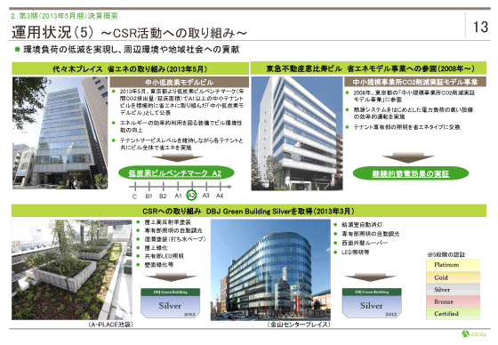 続いて、運用物件のCSR対応についてご説明致します。 東京都の行う省エネモデル事業への取り組みの認定として、代々木プレイスが7段階中、上から3つ目の評価を頂きました。 本ビルは、テナントと一体となってビル全体で省エネを実施したことがポイントとなっております。 また、中小規模事業所CO2削減実証モデル事業として、2008年から東急不動産恵比寿ビルが参画しており、費用削減効果も上がっています。 さらに、日本政策投資銀行の認証するGreen Building認証として、A-PLACE池袋と金山センタープレイスがSilverを取得しております。 このように環境に配慮し物件を運用することは、上場REITとしての使命の一つと考えており、今後も更なる取り組みを継続して参ります。