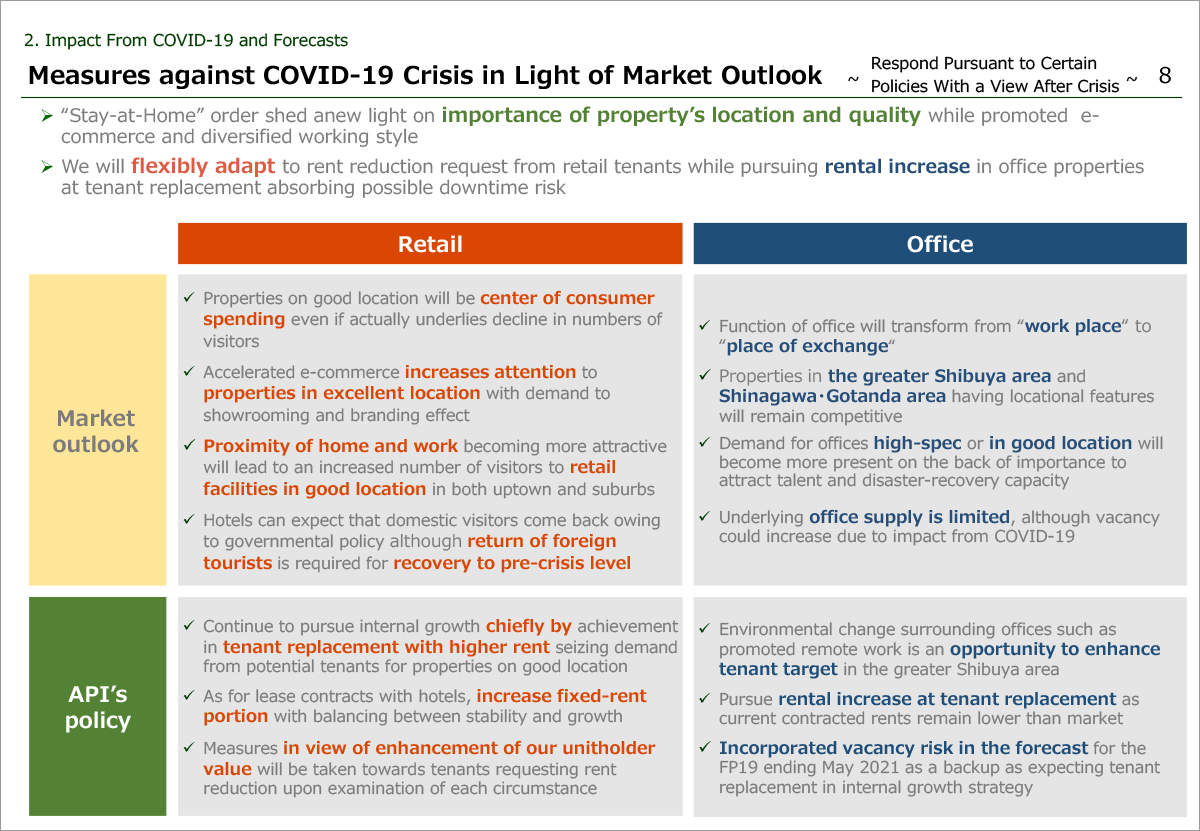 Our response to COVID-19 crisis in light of the market outlook is as follows. For retail properties, we will continue to pursue internal growth at tenant replacement as we confirmed a solid demand for the properties in good location. As to relief requests, we will watch each tenant’s circumstances and deal with individually.