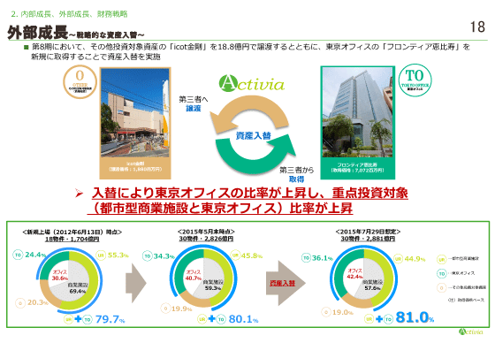 先日の開示でもお知らせいたしましたが、第8期において、その他投資対象資産の『icot金剛』を売却し、東京オフィスの『フロンテティア恵比寿』を新規に取得、資産の入替を行うことといたしました。