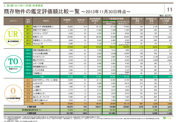中央の緑の枠に、第4期末、21物件の鑑定評価額、その右隣に第3期末(2013年5月期)の鑑定評価額を記載しております。