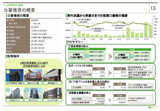 本投資法人は、昨年12月に約347億円の公募増資を行い、6物件を取得致しました。当該募集を行った意義は、①資産規模の拡大、と当時に、②ポートフォリオを強化すること。さらに、③LTVの低下による借入余力を今後の機動的な物件取得に充当することで、④分配金とNAVの成長を実現することです。 本募集では、投資口価格も発行決議日の805千円から、権利落ち15千円を挟んだにも関わらず、条件決定日の803千円と順調な推移となり、これもひとえに皆様のご支援の賜物と思っております。 今後も、皆様のご期待に応えるべく、しっかりと取得及び運用を行っていきます。 次ページ以降で、取得物件の概要をご説明いたします。