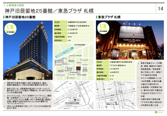 左側が、公募増資の旗艦物件、神戸旧居留地25番館です。本物件は、スポンサーのウェアハウジングを活用し、取得致しました。 本物件はラグジュアリーブランドが集積する仲街通りに面し、希少性の高いプレミアム立地にあります。1階路面には世界で15店舗、日本初の、フルラインの製品を揃える旗艦店ルイ・ヴィトン・メゾンと、関西唯一の店舗であるバーニーズ・ニューヨークが店を構え、3階以上はホテルウェディングとして注目されるPlan・Do・Seeの運営するオリエンタルホテルが入居しています。 テナントとは長期の契約で、原則、固定賃料となっており、ポートフォリオ全体の安定性に寄与するものと考えています。