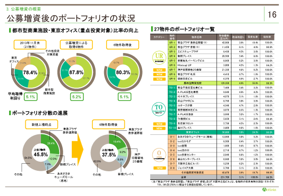 以上の公募増資の結果、ポートフォリオの強化を図ることができました。 上段パイチャートでは、重点投資対象比率の推移をお示ししていますが、6物件取得後は78.4%から80.3%にあがっています。また、取得環境の厳しい局面ですが、6物件の平均取得利回り5.2%、27物件全体で5.1%を維持し、ポートフォリオの質を維持しながら成長しています。 また、下段をご覧いただきますと、東急プラザ 表参道原宿を筆頭とした上位3物件の投資比率は、45.5%から37.5%に縮小し、バランスの取れたポートフォリオ構成と収益の安定性が向上するものと考えています。