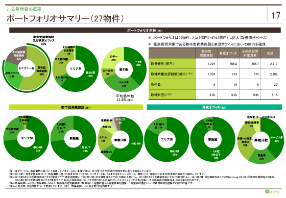 ポートフォリオサマリーです。 第4期末時点には21物件であった物件構成は、現時点では27物件、取得価格は合計2,317億円です。平均取得利回りは5.1%です。 また、左上のパイチャートにありますが、重点投資対象である都市型商業と東京オフィスの割合は80.3%、エリア別では都心比率68%と、引き続き重点投資対象への投資とポートフォリオの質の強化を実現しています。 左下のパイチャートをご覧ください。都市型商業は神戸や札幌といった主要都市がポートフォリオに加わり、都心5区73%、三大都市圏は23%の比率となり、人のにぎわう都市の中でも、立地にこだわった物件を取得しています。 右側、東京オフィスでは、都心5区で83%、すべて駅から5分以内と、立地優位性の高い物件となっています。 今後も、このようなポートフォリオの質を高めるような物件取得に努めてまいります。