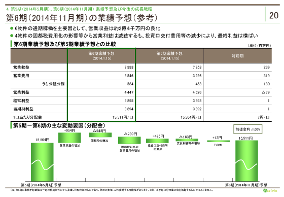 続いて、第6期(2014年11月期)の業績予想です。 対第5期予想では、賃料収入は、POの取得6物件の通期稼働等により増収を見込み、営業収益は2億39百万円増加の79億93百万円を見込んでいます。 また、IPO以降取得した9物件中7物件の固都税費用化等から、営業利益は79百万円減益の44億47百万円を見込んでいます。 一方、金利を1.05%と、前期より5ベーシス上昇させ予算を作成していますが、PO関連費用がなくなることから、経常利益及び当期純利益は前期比ほぼ横ばいを見込んでいます。 結果、一口当たり分配金は7円増加の15,511円となる見込みです。
