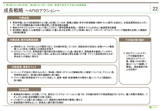 本投資法人の成長戦略についてご説明致します。 まず、外部成長戦略です。売買市場における取得競争がより激しさを増している中、上場後1年半の取得実績(9物件・613.3億円)を踏まえ、本資産運用会社とスポンサー双方の情報収集力を最大限活用した取得活動を継続してまいります。そして、物件のクオリティとロケーションにこだわり、「都市型商業」と「東京オフィス」を中心に厳選投資を継続していきます。公募増資によるLTV引下げによる追加借入余力を活用した取得に加えて、スポンサーのウエアハウジング機能等様々な手法も活用した機動的な取得を実施してまいります。 内部成長については、都市型商業では長期安定を軸に、施設満足度の向上及び売上増につとめます。東急プラザ赤坂、東急プラザ札幌、神戸旧居留地25番館では、特に、海外からの観光需要によるインバウンド需要の増加によるホテル部分の歩合のアップサイドが、期待できるのではないかと考えます。 東京オフィスでは、第4期に増額改定実績3件が出来たことから、引き続き、テナントとの関係重視の上、増額改定の実績を積み上げていきたいと考えます。その他GRESBのスコアアップ等の環境対応による資産価値向上も目指します。 財務戦略は、盤石な基盤を継続するとともに、機動的な物件取得を行えるような柔軟性も構築し、本投資法人の成長を支えていきたいと考えます。