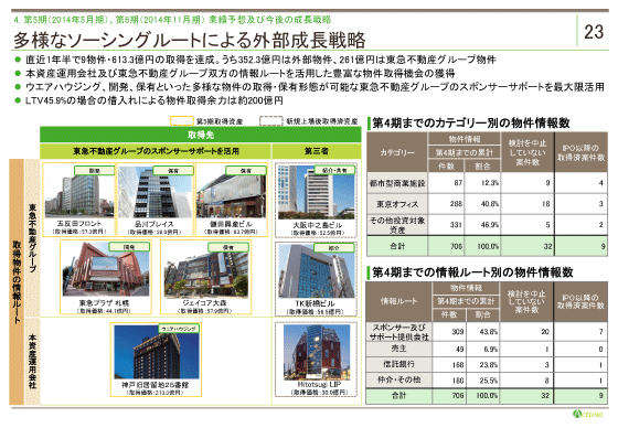 外部成長についてです。 本投資法人は、上場後1年半で、9物件・613.3億円の物件を取得してきました。このうち、352億円は第三者からで、スポンサーからの取得は261億円です。 このように、スポンサーサポートを活用しながらも、本資産運用会社独自のパイプラインも強固になっています。 多様な取得機会・手法を活用し、 資産規模4,000億円を目指していく所存です。 そのステージ実現へ向け、現在も、多くの物件情報を頂いています。 今後も、取得機会を最大化すべく多様な取得手法を駆使して、物件取得に注力してまいります。