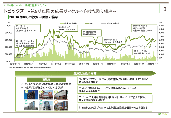 上段は、第4期の投資口価格の推移です。東証REIT指数は昨年4月から調整局面に入り、本投資法人の投資口も一旦弱含む局面もありましたが、昨年以降、東証REIT指数をアウトパフォームしてきました。引き続き、皆様のご期待に添えるよう、運用実績を残していきたいと考えております。 また、今後の取組みを下段に記載しています。第5期の初めに公募増資を実施し、新規上場後1年半の間に9物件・取得価格613億円で追加取得致しました。総資産4,000億円へ向け、今後1,700億円の追加取得による資産規模拡大とともに、物件のクオリティにこだわり続けながら外部成長を続け、また引き続きリーシングの強化に努めます。加えて、賃料増額にも積極的に取り組み内部成長を充実させ、ポートフォリオ全体の質を強化していきたいと考えています。そして、DPUとNAVの更なる向上により、投資主価値の向上を目指します。 では、第4期の業績及び運用状況につき、ご説明致します。