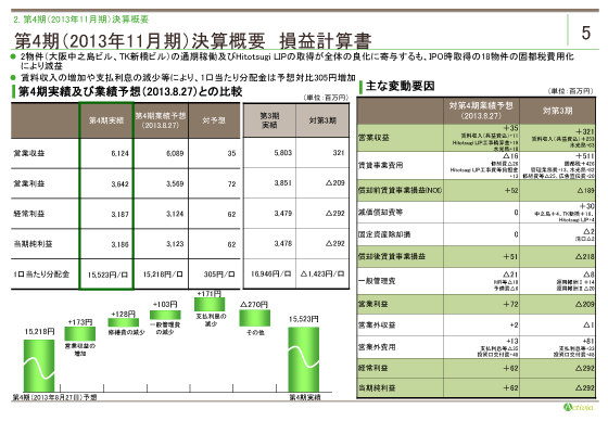 第4期(2013年11月期)決算の損益計算書です。 第4期実績は、営業収益61億24百万円、営業利益36億42百万円、当期純利益31億86百万円、一口当たり分配金は15,523円となり、第4期からは、IPO時取得の18物件の固都税が費用化されています。 Hitotsugi LIP取得に伴う昨年8月の業績予想からは、修繕費や一般管理費、支払利息等費用面の減少などにより、一口当たり分配金は305円増加致しました。 第3期対比では、第3期に取得したTK新橋ビルと大阪中之島ビルの通期稼働に 加え、Hitotsugi LIPの取得に伴う収入の増加が、管理業務費や減価償却費の増加を吸収しましたが、IPO時取得の18物件の固都税約4億26百万円の費用化に伴いNOI以下は減額、また、昨年12月に実施した公募増資関連費用の一部や支払利息等により営業外費用は約81百万円増加し、当期純利益は前期比2億92百万円の減少となりました。 結果、第4期の一口当たり分配金は15,523円、第3期と比べて1,423円の減少となりましたが、予想からは305円の増加となりました。