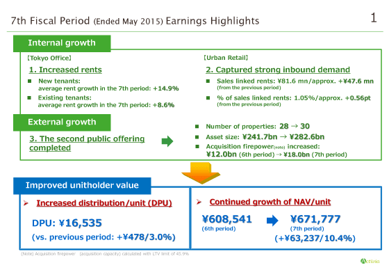 We could achieve improving unitholders' value through the growth of DPU and NAV per unit taking advantage of internal growth in recovering Tokyo office leasing market and increasing inbound demand of foreign visitors as well as external growth through the second public offering.