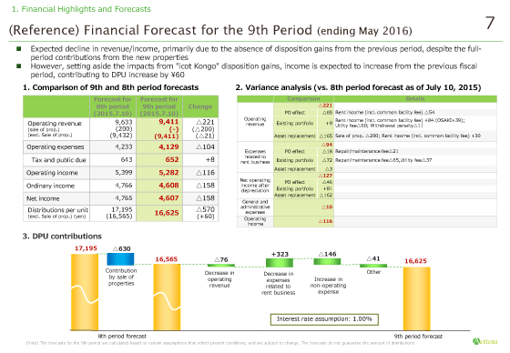 On the basis of excluding profit of disposition, DPU is expected to rise 60 yen compared to the previous period.