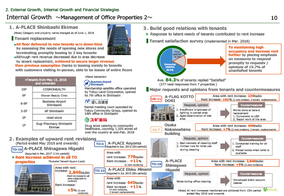 At the bottom, major examples of upward rent revisions are shown. In ”A-PLACE Shinagawa Higashi”, 5% of rent increase in 2,846tsubo is recorded owing to upward rent revision with a major tenant. With this ”A-PLACE Shinagawa Higashi”, in all 15 properties of Tokyo Office properties excluding one land property, upward rent revision has been achieved.