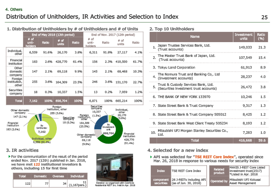 Lastly, let me refer to the situation of our unitholders at the end of the period ended May 2018. The number of unitholders increased to 7,162, from the previous period by 291, that are categorized mainly into ”individuals and others”.