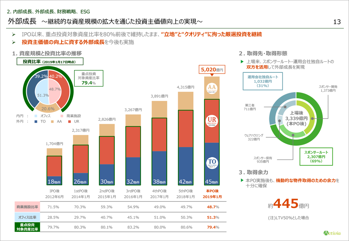 なお、LTV50%までの取得余力は445億円と、本PO実施後も機動的な物件取得のための余力を十分に確保できている状況です。