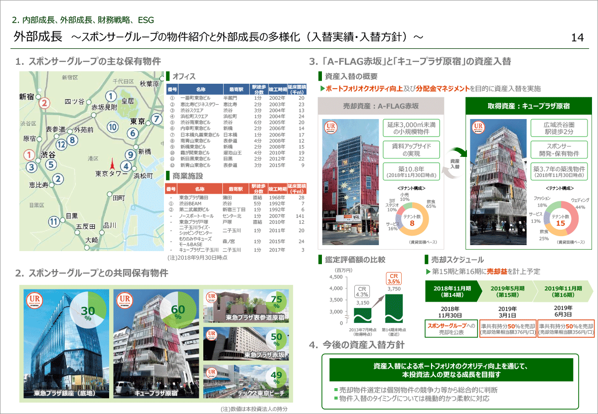本入替では、路面店の入替が完了し、物件価値の向上が実現した「A-FLAG赤坂」を、築浅で広域渋谷圏に立地する「キュープラザ原宿」と入れ替えることで、ポートフォリオクオリティを向上させております。