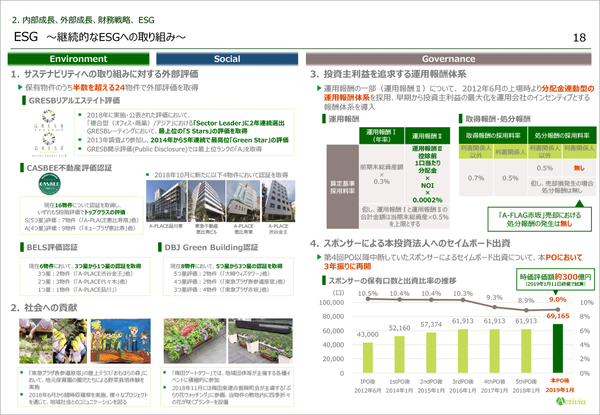 | |  |     次は、継続的なESGへの取り組みについてご説明させていただきます。 まずは、サステナビリティに関する取り組みについてです。 2018年に実施・公表された「GRESBリアルエステイト評価」において、2年連続でアジアにおけるセクターリーダーに選出されるとともに、レーティング評価では本投資法人としては初めて最高位となる「5 Stars」の評価を取得しました。