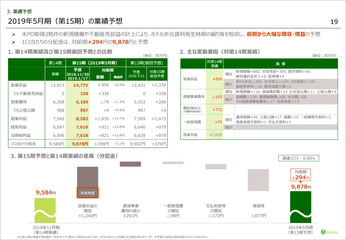 第15期は本POによる取得3物件の新規稼働や、「A-FLAG赤坂」の売却に伴う不動産売却益の計上により、ホテル歩合賃料発生時期の偏り等を吸収し、前期から大幅な増収・増益の予想です。