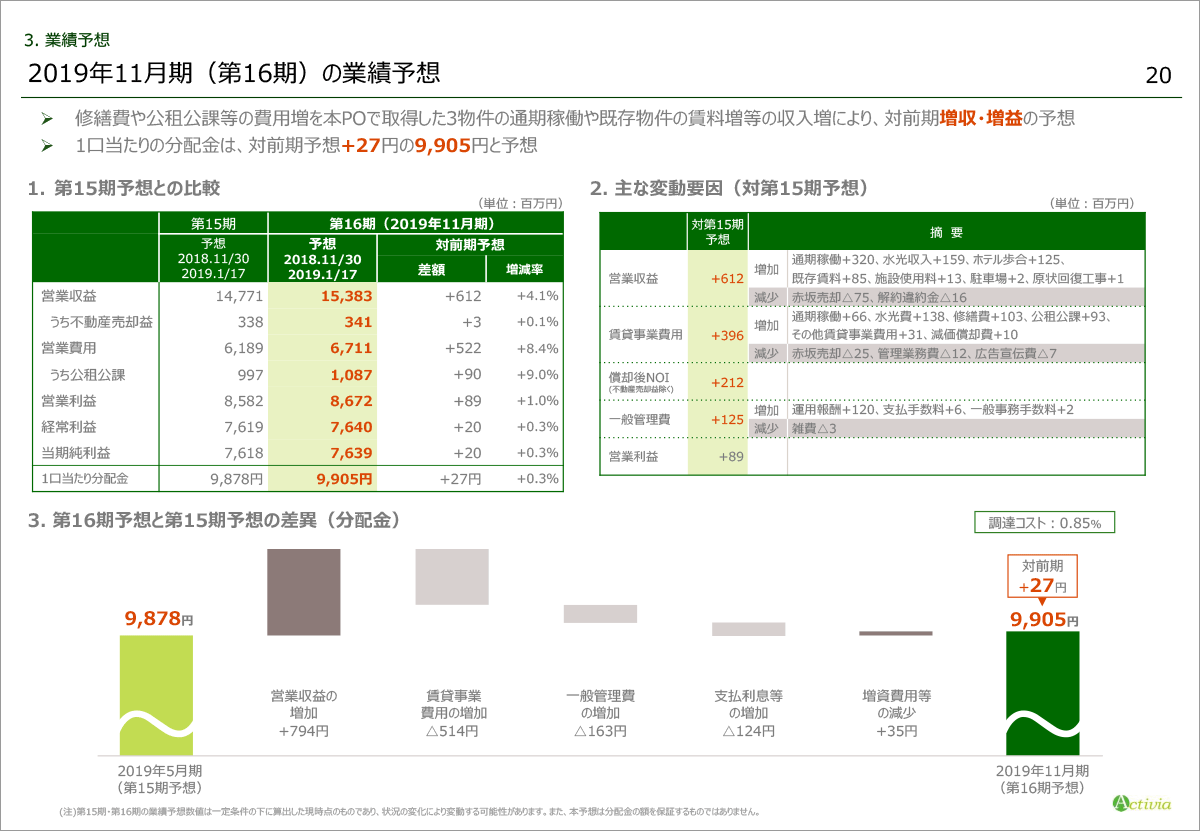 修繕費や公租公課等の費用増を、本POで取得した3物件の通期稼働や好調な内部成長による既存物件の賃料等の収入増により、対前期増収増益の予想です。