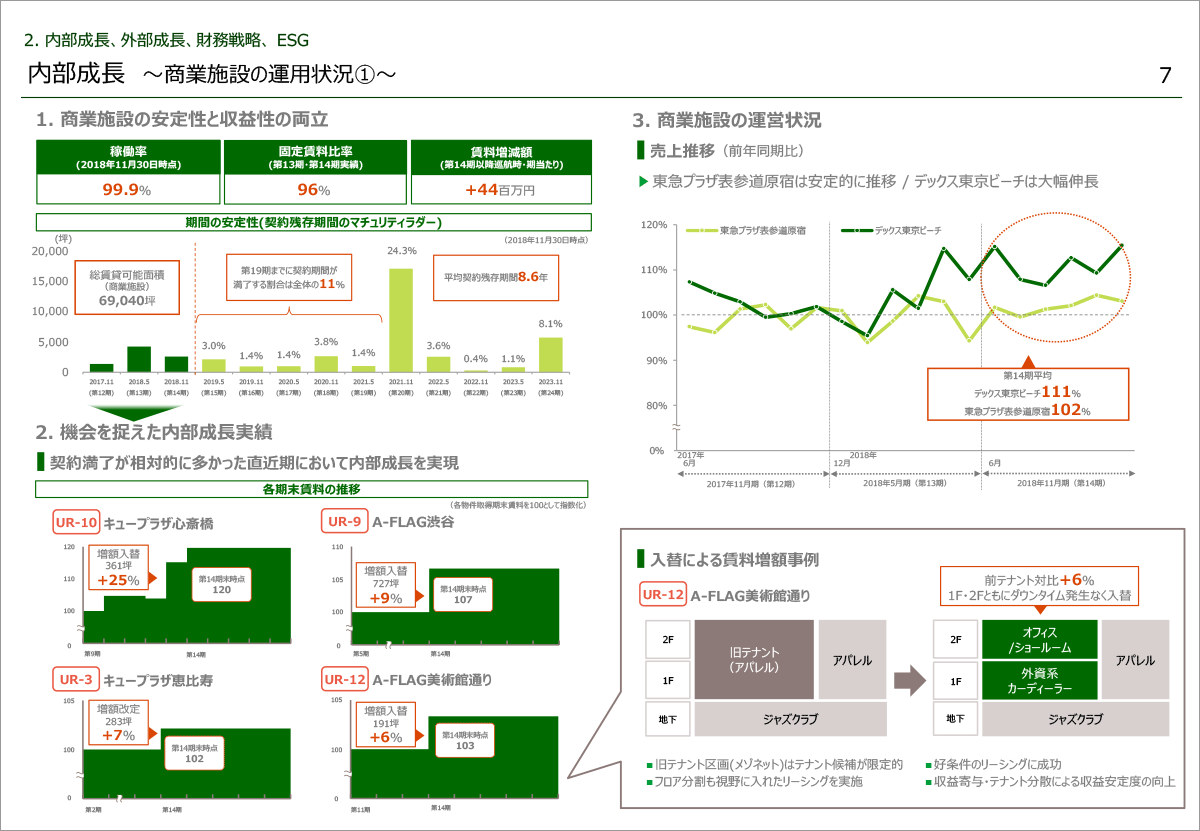 | |  |     7頁からは、商業施設についてです。 第14期末の稼働率は99.9%、固定賃料比率は96%と安定性が高い一方、第14期以降の入替・賃料改定により44百万円の賃料増額を実現しており、安定性に加え収益性も兼ね備えていることが本投資法人の商業施設の特徴です。