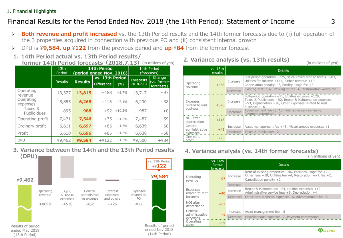 Please refer to the upper left table 1. In the period ended November 2018, operating revenue was ¥13,815 million, operating profit was ¥7,546 million, profit was ¥6,696 million and distributions per unit were ¥9,584.