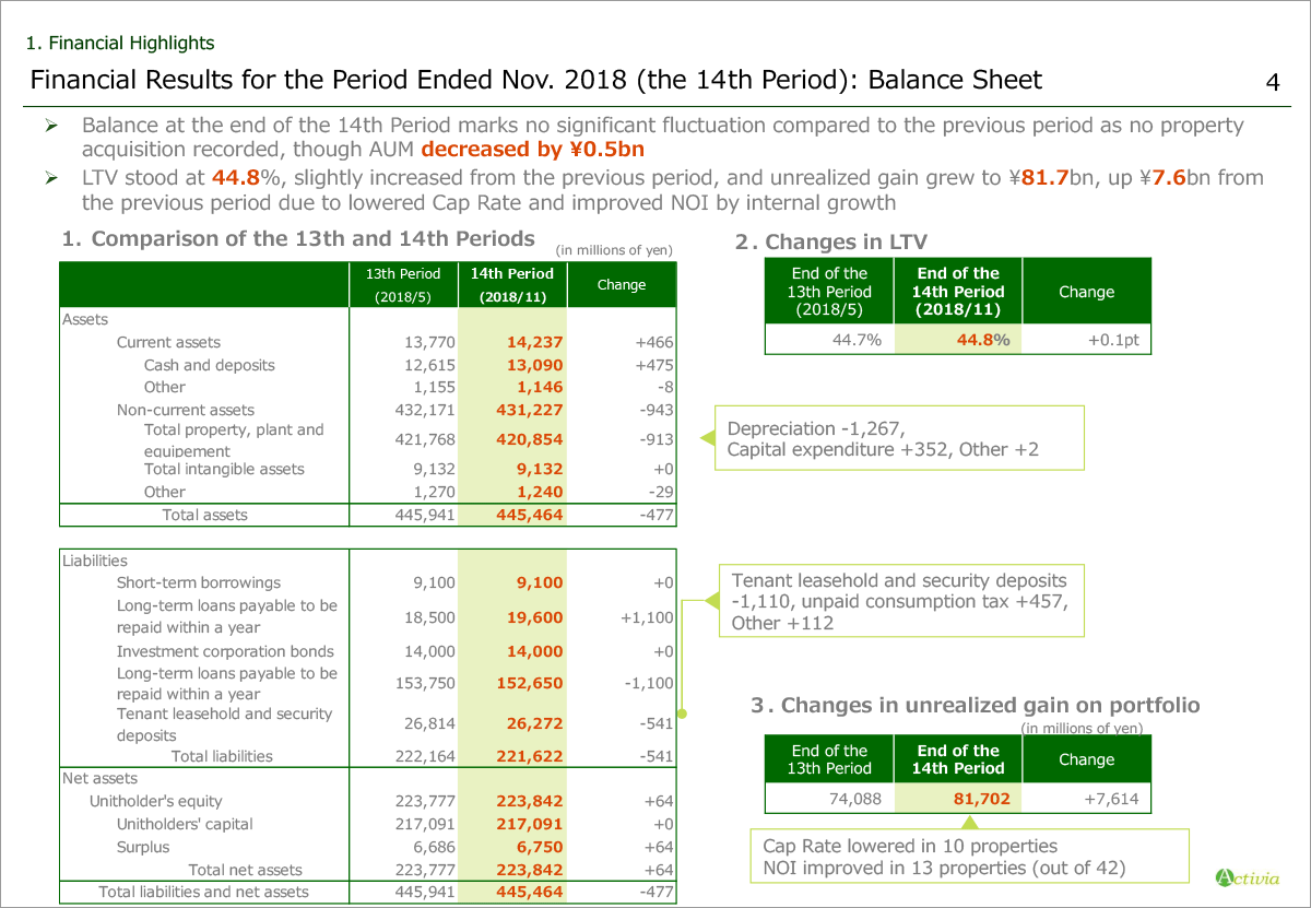 Unrealized gain of portfolio expanded to ¥81.7 billion, up ¥7.6 billion from the end of the previous period due to the lowered Cap Rate and improved NOI realized through internal growth.