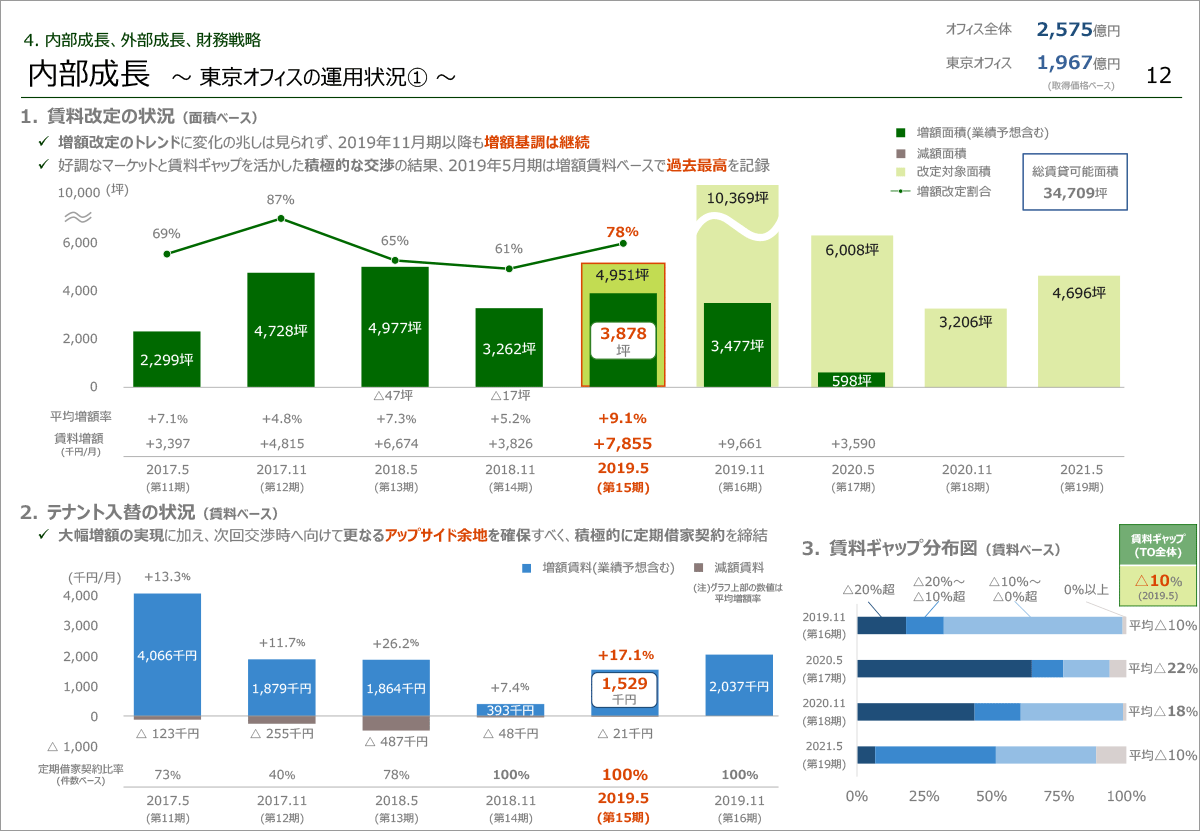 続いて右下の3では期間別に賃料ギャップの分布状況をお示ししております。 2019年5月期末時点における東京オフィス全体の賃料ギャップは、前期末から1%拡大しマイナス10%となっています。 また、2020年5月期及び11月期はそれぞれマイナス20%前後の賃料ギャップと、非常に大きな内部成長余力を有している状況となっており、積極的な増額交渉を通じ、内部成長の実現を目指していきたいと考えております。