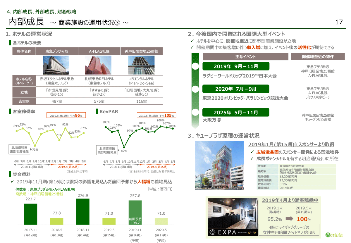 なお、2019年11月期は、赤坂と札幌の2物件の歩合賃料を計上する予定ですが、前回の業績予想発表時では、2018年9月に発生した北海道の地震の影響を保守的に見込み、1億9,870万円の予想としておりました。