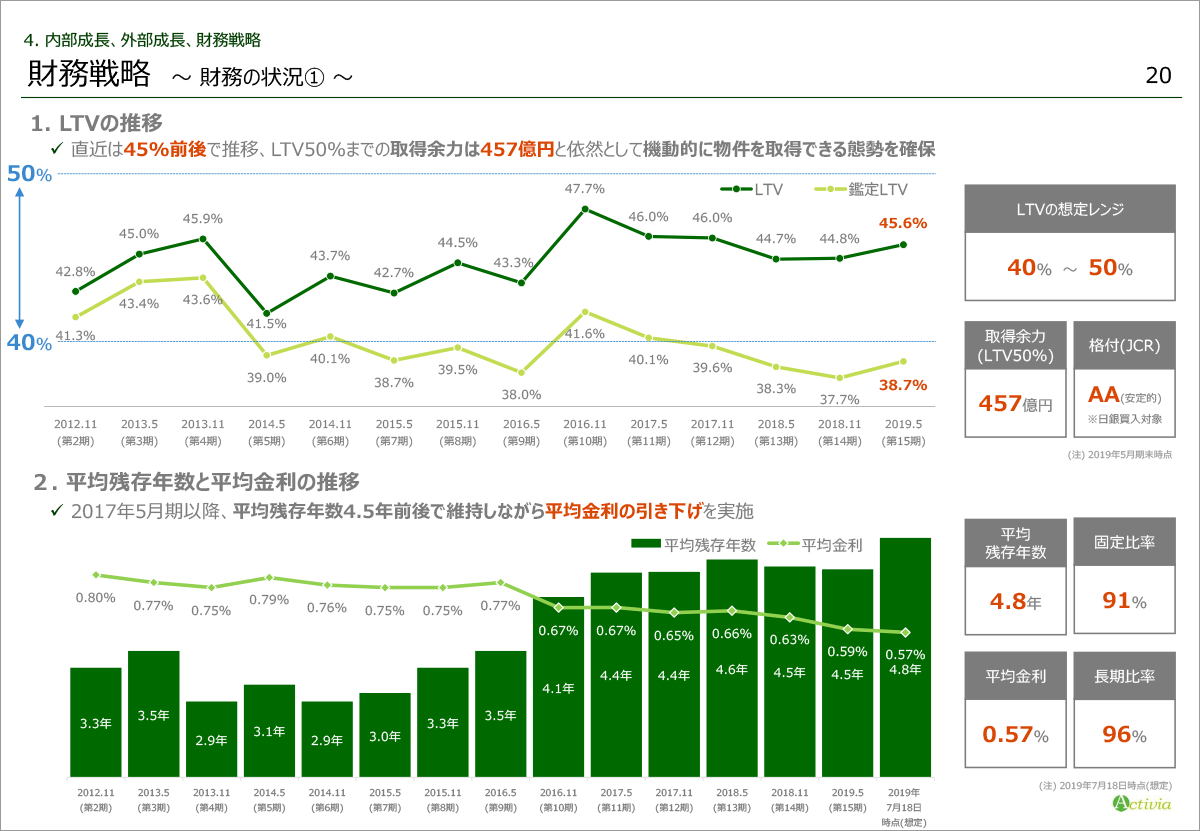 まずLTVについてですが、直近は45%前後で推移しており、2019年5月期末時点では45.6%となっております。 またLTV50%までの取得余力は457億円と引き続き機動的に物件を取得できる態勢を確保しております。