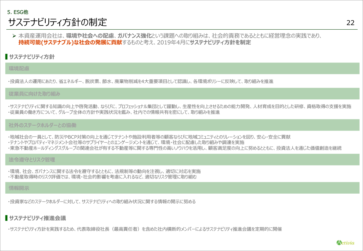 まず22ページと23ページですが、今年の4月に運用会社で策定を行いましたサステナビリティ方針と、このサステナビリティ方針に基づき7月に特定を行ったマテリアリティをご紹介しております。