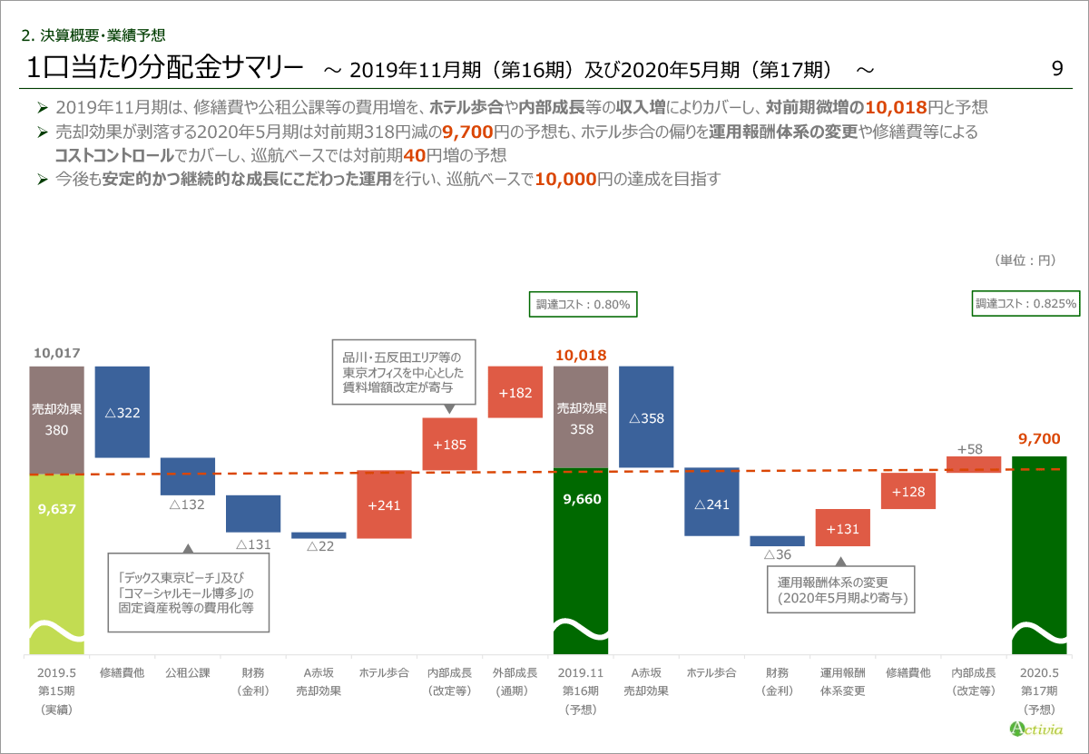 2019年11月期は、修繕費や公租公課等の費用増によるマイナスを、ホテル歩合や好調な内部成長等でカバーし、1万18円、売却効果を除きまして9,660円と予想しております。 また、2020年5月期については、売却効果の剥落やホテル歩合によるマイナスを、運用報酬体系の変更や修繕費等のコストコントロールでカバーし、巡航ベースでは前期より40円増加の9,700円を予想しております。