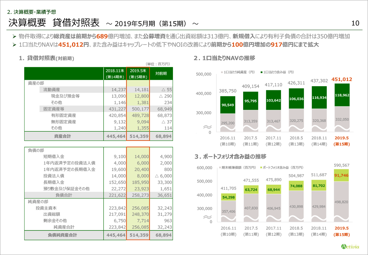 また、右側でお示ししております1口当たりNAVについては、下段の通り含み益が増加にしていることに加え、公募増資により純資産が増加した結果、2019年5月期は45万1,012円となっております。