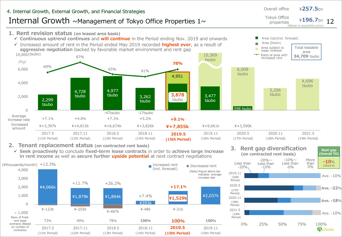 The bottom right 3 shows rent gap diversification by each period. The rent gap for Tokyo Office properties as of the end of May 2019 has stood at negative 10%, widened by 1%.