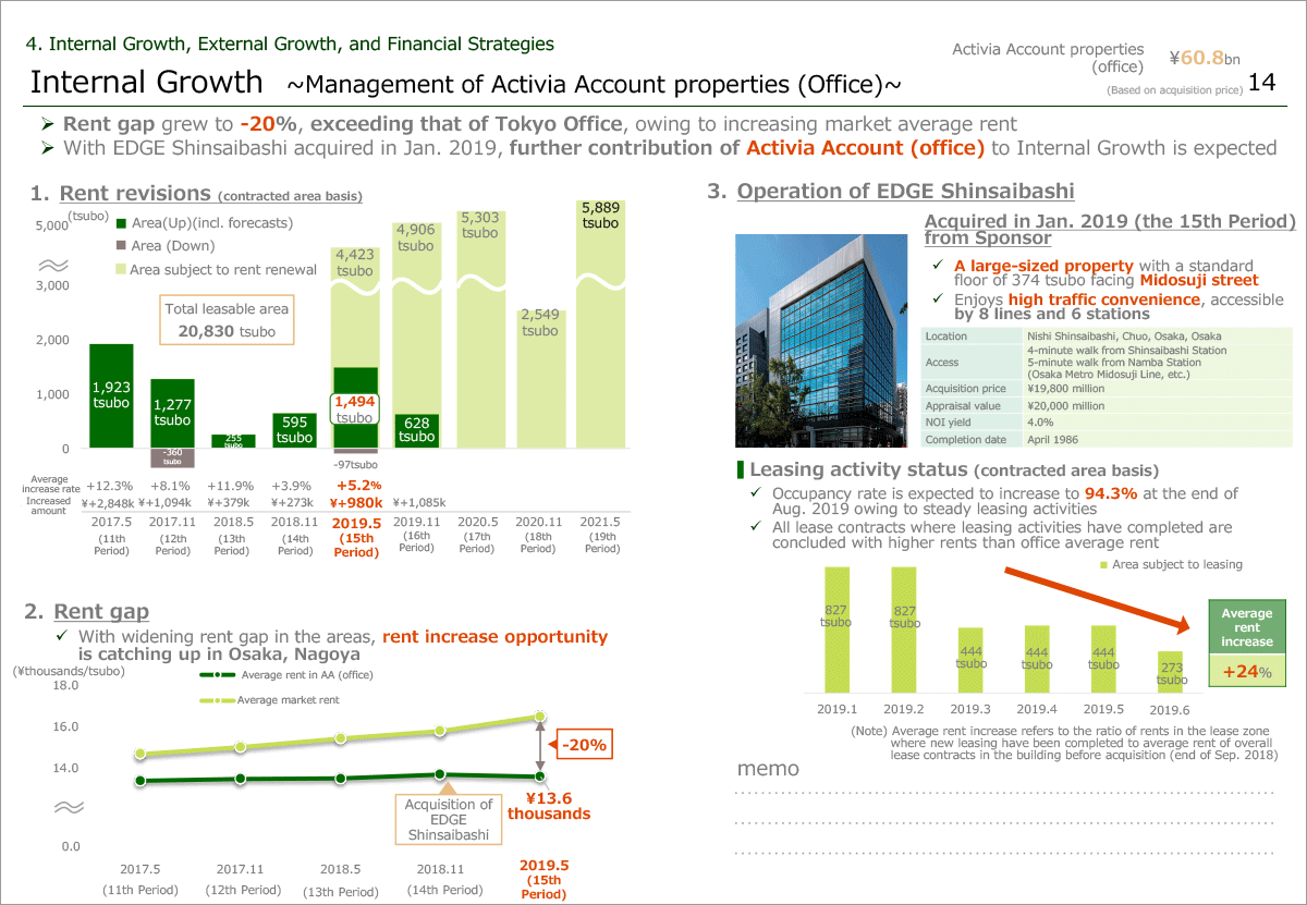 Currently five offices are categorized as Activia Account office properties with an acquisition price of ¥60.8 billion or approximately 12% of entire portfolio, which is not a large portion. However, a condition for further internal growth has been established and we expect an increase in its presence.