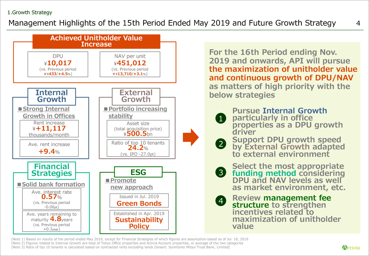 Strategy one: pursue internal growth mainly in office properties as a DPU growth driver Strategy two: support DPU growth speed by external growth adapted to external environment Strategy three: select the most appropriate funding method considering DPU and NAV levels as well as market environment, etc. Strategy four: review management fee structure to strengthen incentives related to maximization of unitholder value