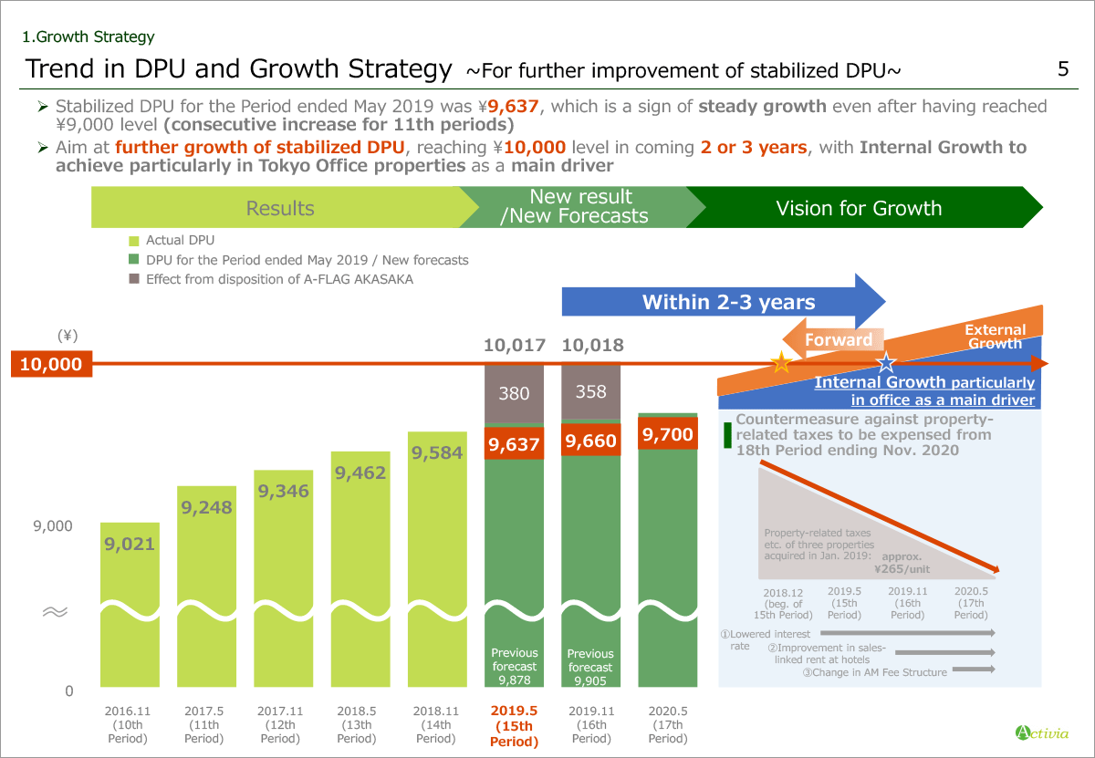 In addition, not only to make early achievement of stabilized DPU of ¥10,000 by realizing further internal growth via tenant replacements and seeking an external growth which accelerate DPU growth, we will also aim to achieve further growth in stabilized DPU by acquiring office properties in which we can expect internal growth.