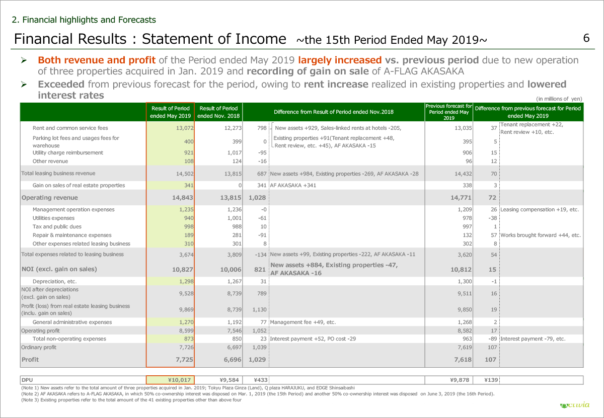 We achieved increases in both revenue and profit from the results of the previous period owing to new contribution of the three properties acquired in January 2019 and disposition of A-FLAG AKASAKA. Compared to the previous forecasts of the period also, we achieved increases in both revenue and profit owning to consistently achieved internal growth and decrease in interest cost.