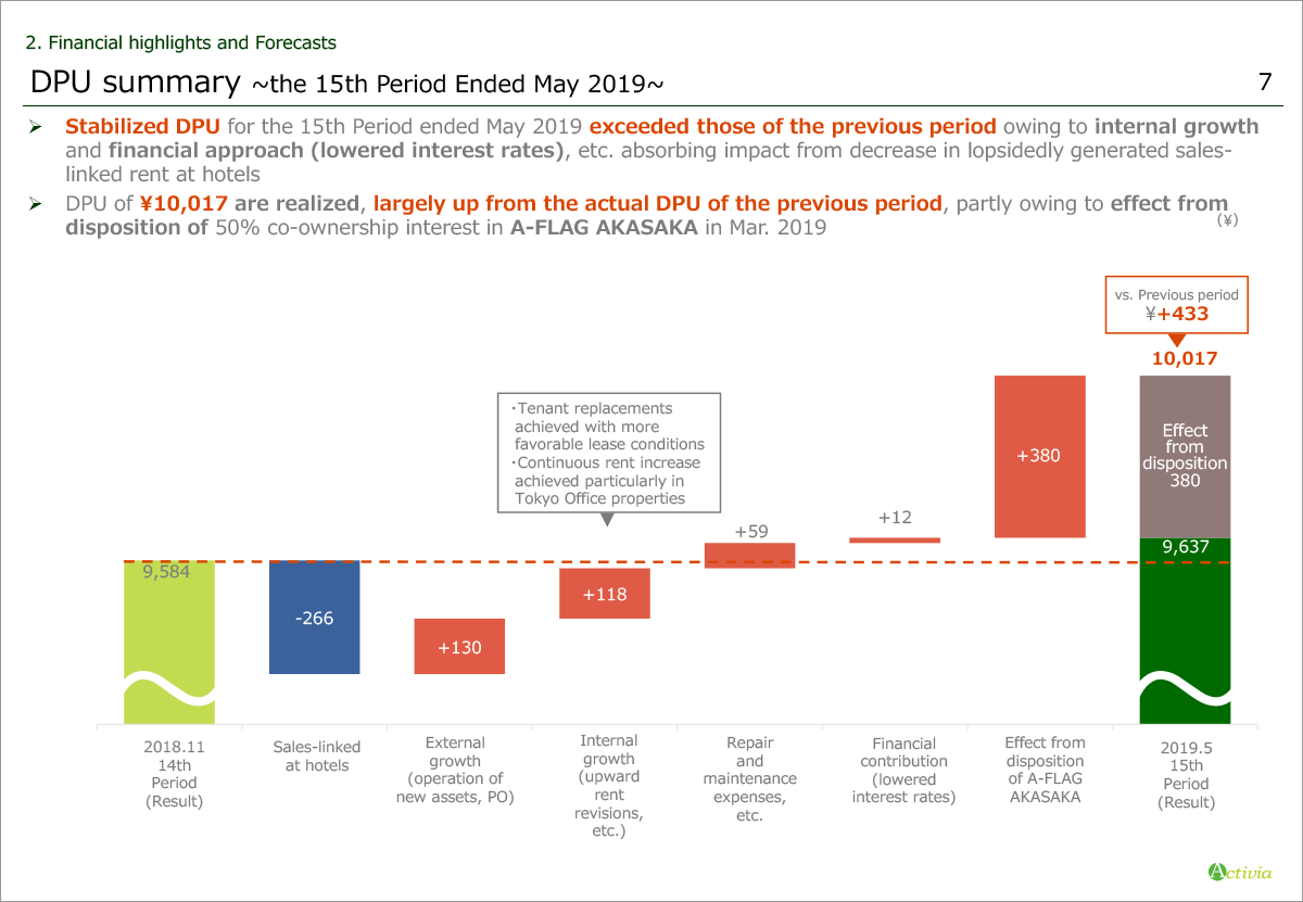 DPU for the 15th period ended May 2019 reached ¥10,017 including the effect from the disposition of A-FLAG AKASAKA, and ¥9,637 as a stabilized DPU, both exceeding those of the previous period result for 11 consecutive periods, owning to a new contribution of three properties acquired in January 2019 and internal growth via tenant replacements with favorable terms and rent increase, absorbing negative impact from lopsidedly generated sales-linked rent at hotels.